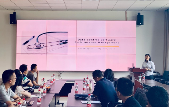 在报告中,蔡教授将经济学理论与软件健康管理相融合,详细介绍了以数据为中心的软件健康管理分析模型、DL软件质量指标、可支持软件质量分析的工具集DV8在工业项目中的工程应用案例等。同时,结合报告具体内容,蔡教授还为在场师生分享了自己在美国Drexel大学讲授《软件体系架构》和《软件设计模式》课程中的教学趣事和美国学生在软件架构学习中遇到的各种问题。在一个多小时的报告里,蔡教授以真实的软件系统数据为引导,将自己在软件体系架构领域最新的研究成果分享给与会师生,让与会师生对软件架构、软件质量管理的学术前沿有了更深入的认识和思考。在讨论交流环节,与会师生基于蔡教授分享的内容开展了热烈的讨论和交流,蔡教授针对与会师生所提出的问题也给予了认真而细致的解答。