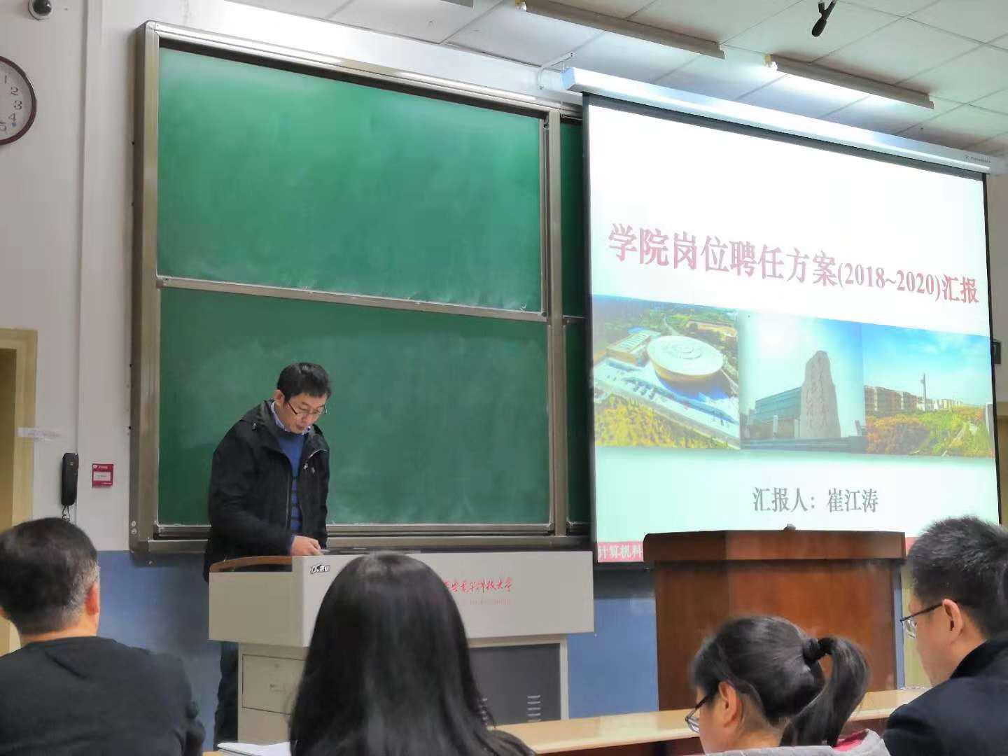 学院执行院长崔江涛向大会汇报了计科院《2018-2020专业技术岗位聘任方案》,并提请大会审议通过。他解读了方案的总体思路、岗位设置及职责等主要内容,介绍了该方案的制定、广泛征求基层意见和修改完善等情况。他指出,根据学校整体工作部署,学院将通过《方案》的实施,真正建立“分类设岗、按岗聘用、目标管理”的岗位管理体系,进一步推动学院“一流学科”建设战略落地落实。