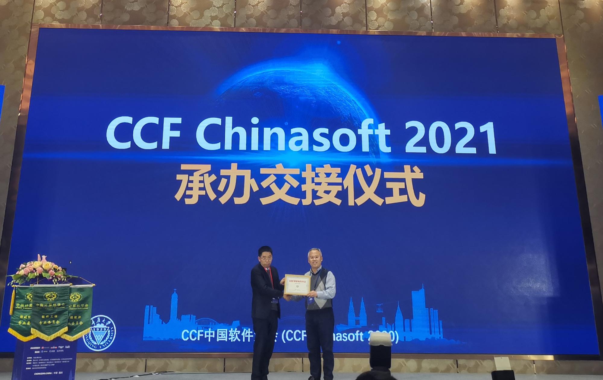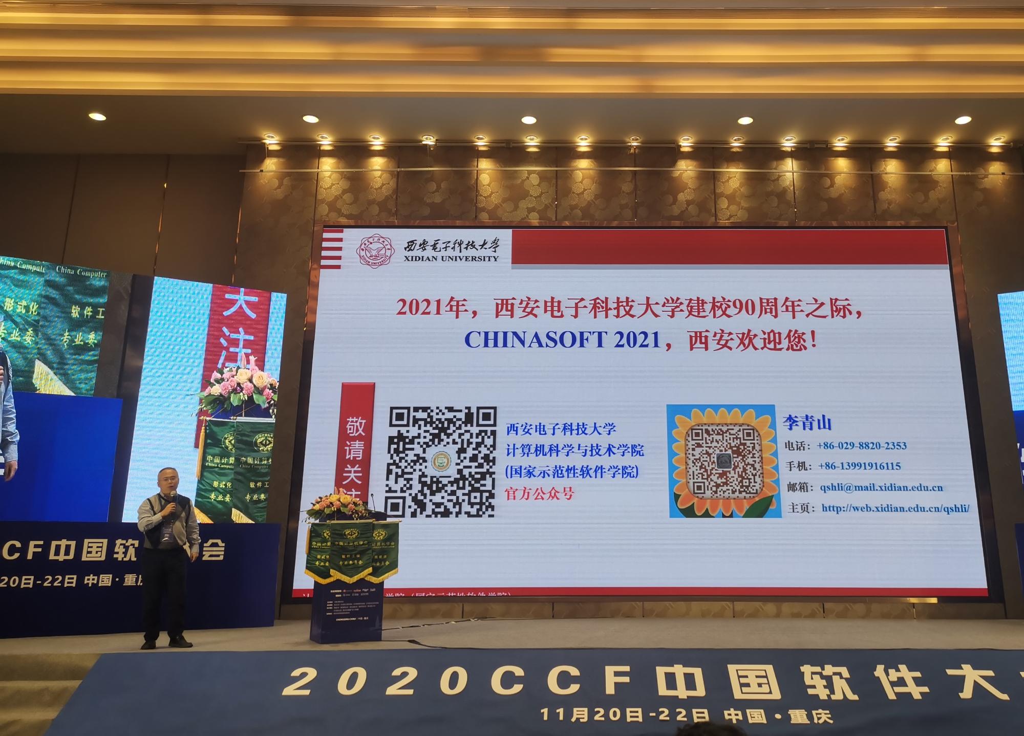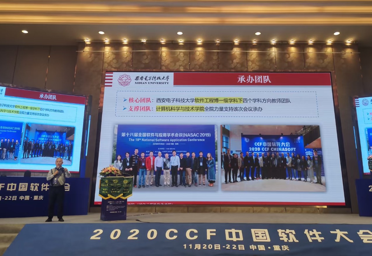 (通讯员 徐悦甡)2020年11月20日至11月22日,CCF中国软件大会(CHINASOFT)在重庆召开,会议由中国计算机学会(CCF)主办,CCF系统软件专业委员会、CCF软件工程专业委员会、CCF形式化方法专业委员会、重庆大学大数据与软件学院承办。best365手机版官方网站软件工程学科四个学科方向的骨干教师20余人及部分学生,在学科负责人李青山教授、学科方向负责人田聪教授、刘西洋教授、苗启广教授以及学科秘书长宋胜利教授的带领下参加了会议。学科参会教师和学生有多篇论文被录用并被推荐到《软件学报》等知名期刊,参会教师和学生还在大会举办的教学与学科竞赛中获得佳绩。特别地,我校获批了明年CCF中国软件大会的承办权,李青山参加了下届会议的承办交接仪式。