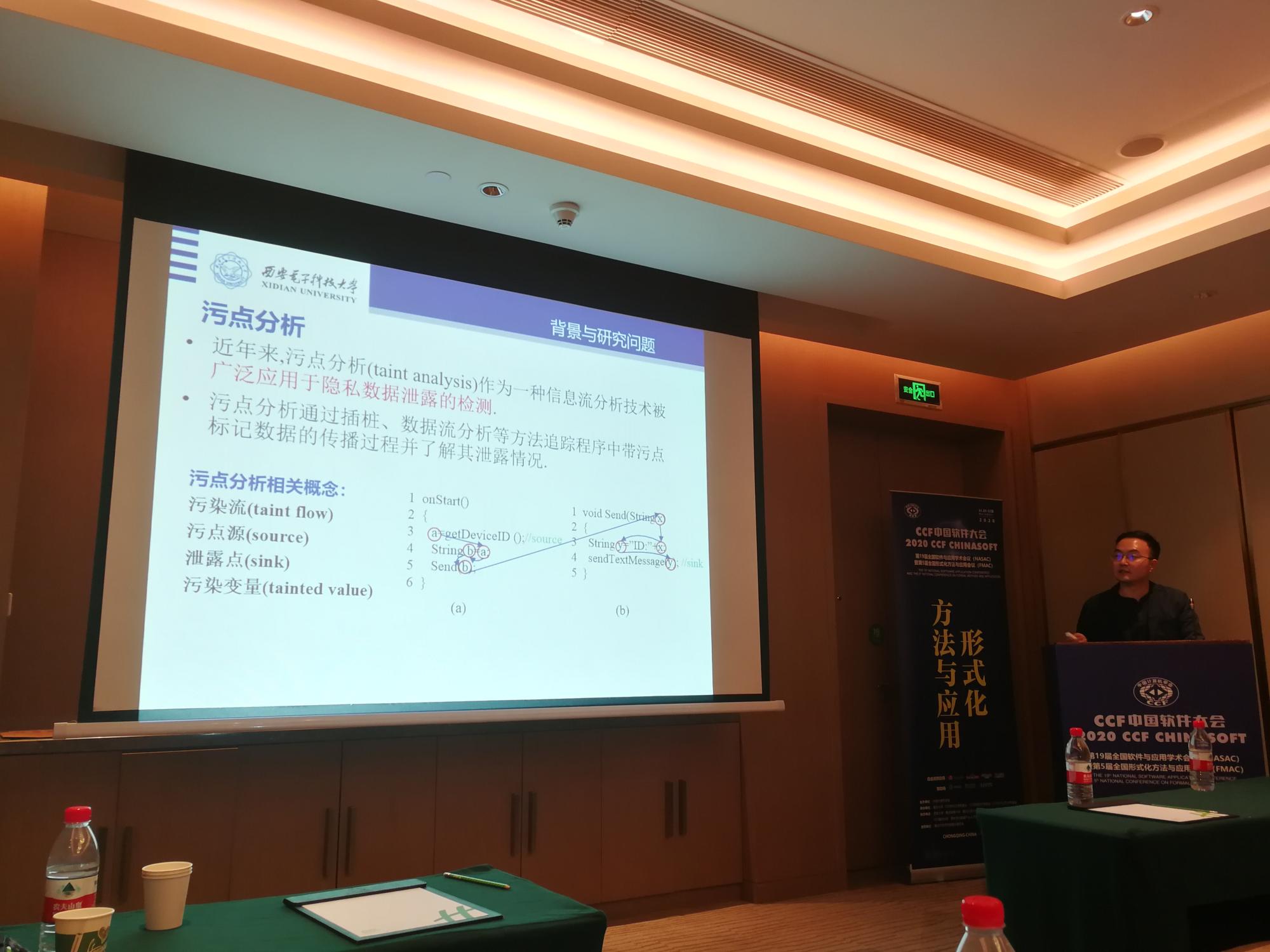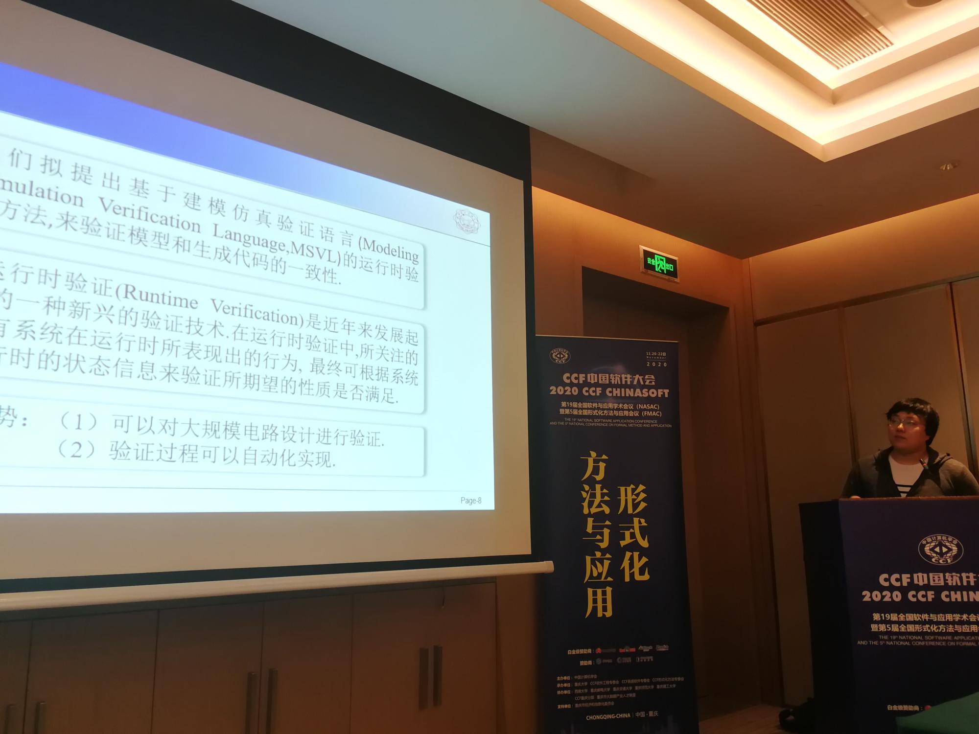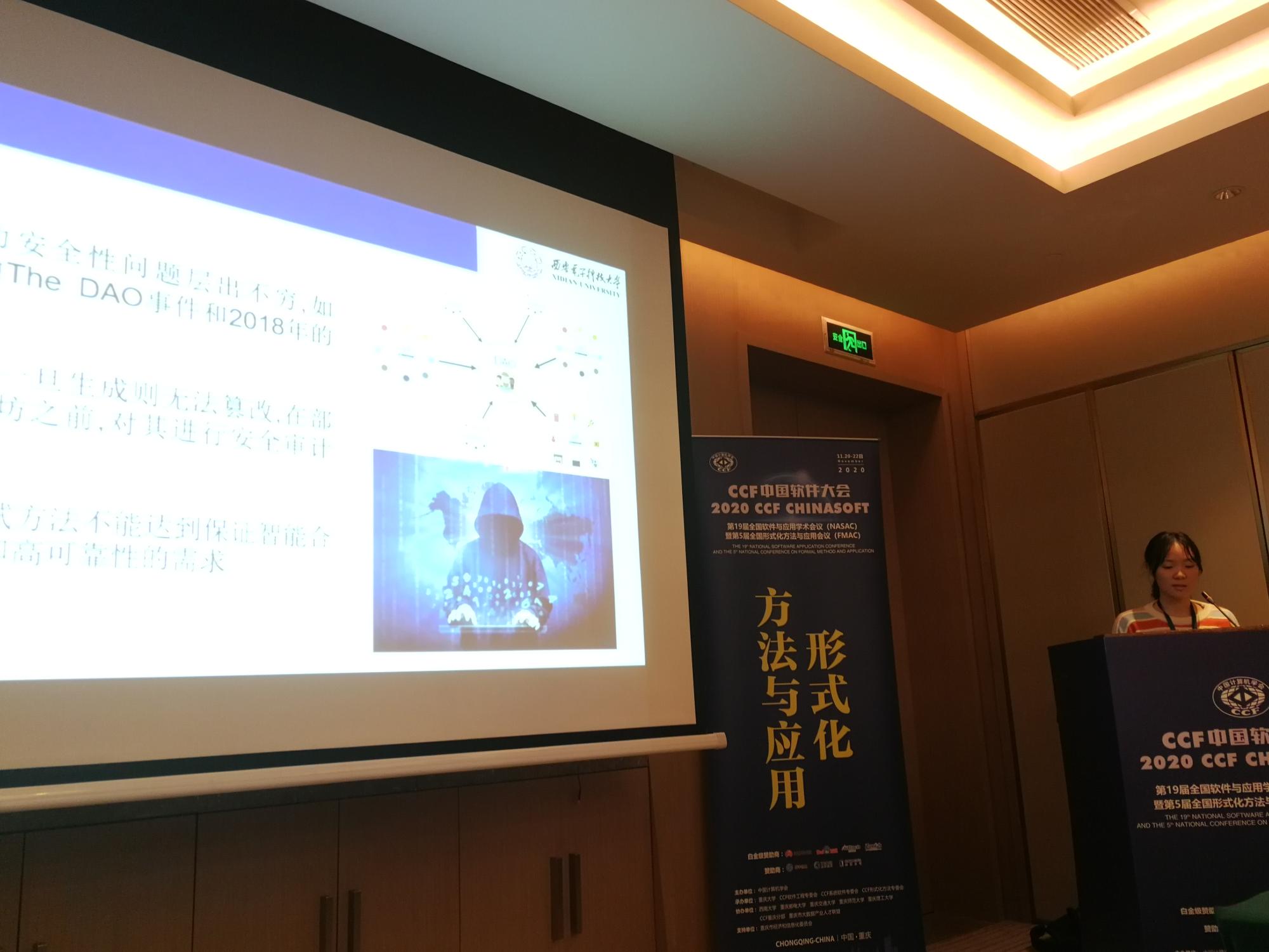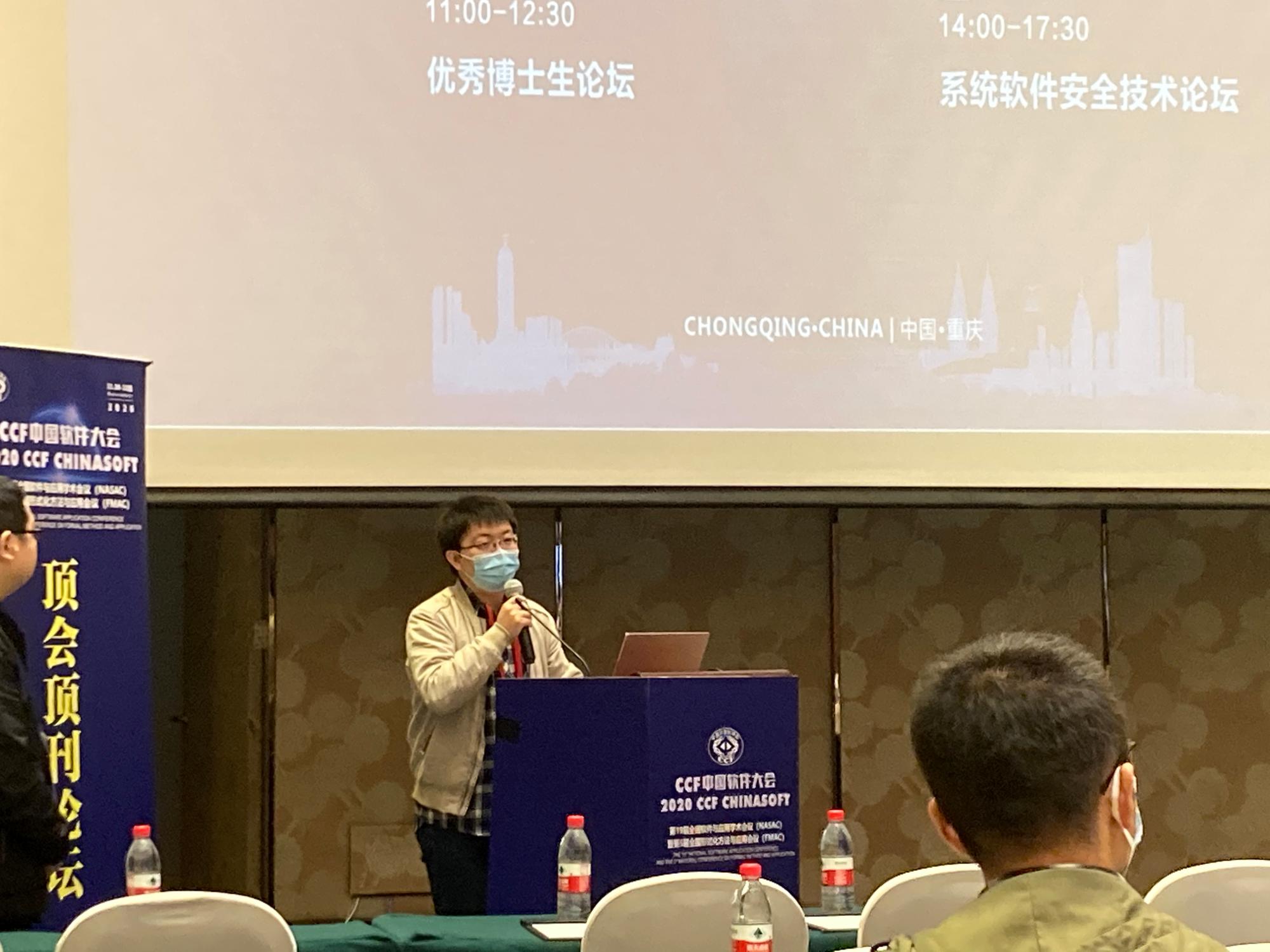 学科参会教师与学生代表在大会上还汇报了多篇被录用的大会论文,被录用的论文同时会被推荐到《软件学报》等知名期刊发表。其中,包括王小兵副教授的论文《基于MSVL的智能合约形式化验证》,张南副教授的论文《芯片开发的功能验证形式化方法与应用》,张捷博士的论文《基于污染变量关系图的Android应用污点分析工具》以及王璐博士的论文《SAFER:基于事件关系保障识别质量的自适应分析方法》等。