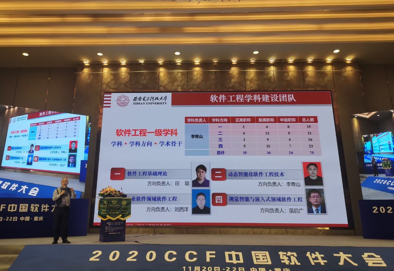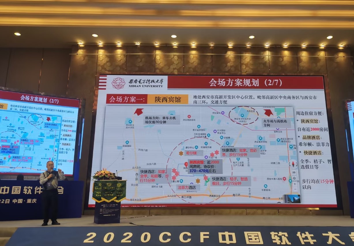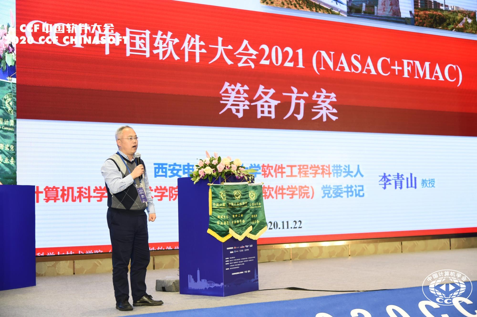作为大会闭幕式的重要环节,11月22日下午,李青山代表学校、学院与学科,从承办单位概况、会议筹备方案、承办城市环境三个方面向各专委会常委以及参会代表阐述了CCF中国软件大会2021的筹备方案。在承办单位概况部分,李青山介绍了西电的发展历史与学科特色,总结了西电软件工程学科的发展历程与学科团队,回顾了举办过的软件工程领域的相关会议,阐明了西电软件工程学科与国内软件工程学科的紧密关联。接下来,李青山在介绍以往学科团队办会经验的基础上,给出了会场方案的规划,并从接待水平、设施设备、住宿条件、地理交通、周边环境等多个维度对可能的会场方案进行了综合分析。之后,李青山向与会代表简要介绍了承办城市西安在文化、科教、交通等方面的良好环境。