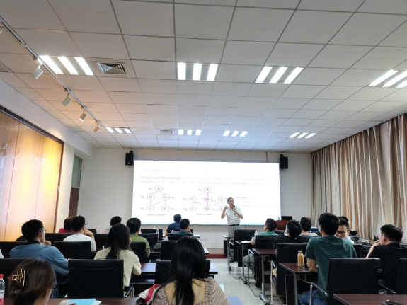 邹磊教授作为了题为《(子)图匹配:算法、系统和应用》的报告。他之处(子)图匹配在计算机领域的图像检索、化学分子式检索、知识图谱查询和社交网络分析中都有很多应用。他首先回顾(子)图匹配的几种经典算法思路以及最新的优化策略;作为目前图数据库查询语言(例如SPARQL和Cypher等)的基础算子,重点讨论从图数据库查询执行的角度来探讨(子)图匹配算法在设计和系统优化方面的一些研究点,以及团队在这方面的一些最新工作。报告最后,现场师生积极向邹磊教授请教学术问题,邹教授一一解答。