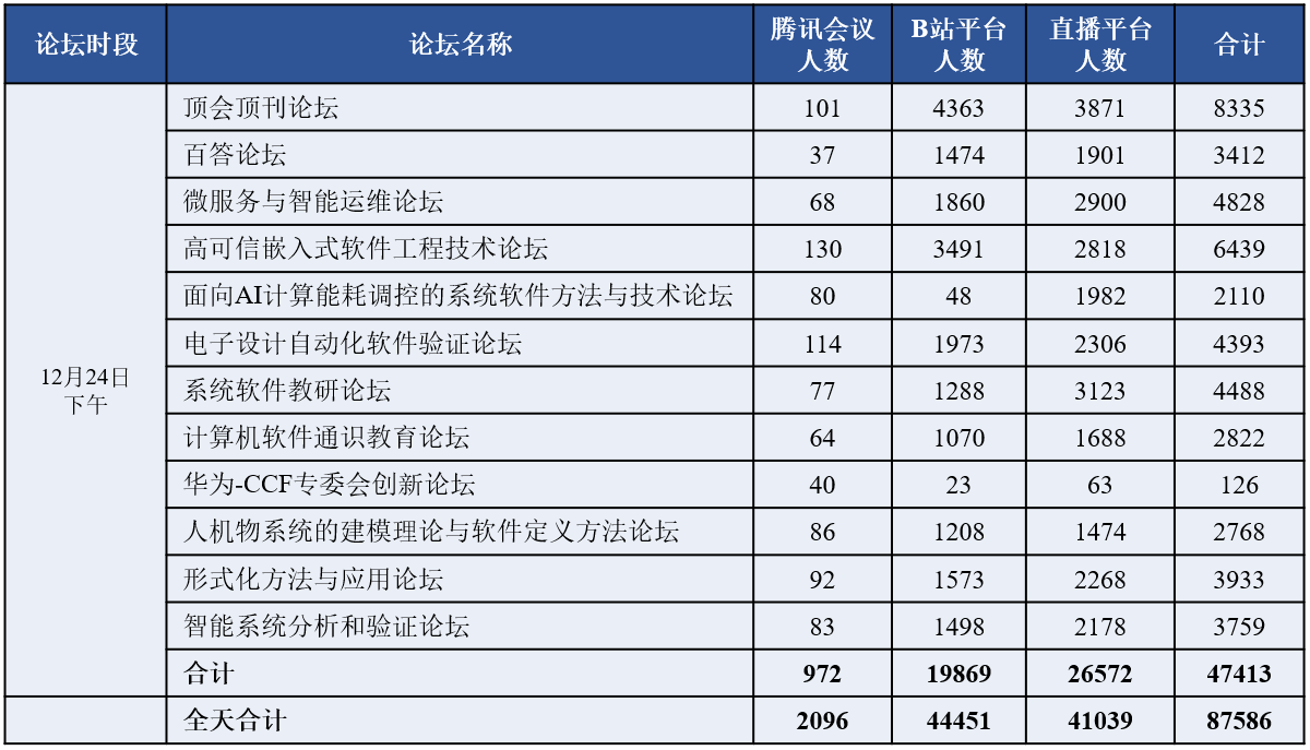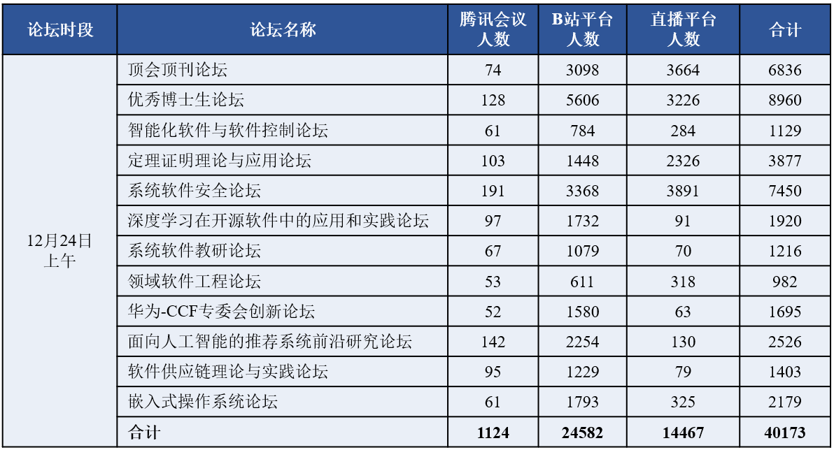 组委会提供了多种线上参会方式,包括腾讯会议室、B站直播间、线上直播平台等。24日大会吸引了国内外软件工程相关领域师生与从业人员的广泛参与,当天上午与下午各论坛的腾讯会议室同时在线人数均接近或超过1000人,B站直播间同时在线人数均接近或超过2万人,线上直播平台同时在线人数均接近或超过1.5万人。当天累计腾讯会议室在线参会人数超过2000人,B站直播间累计在线人数超过4.4万人,线上直播平台累计在线人数超过4万人,全天合计超过8.7万人。