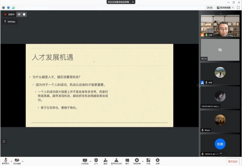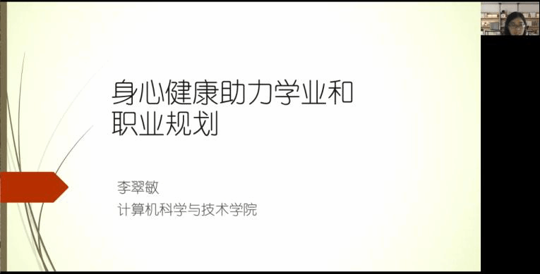 1月8日,李翠敏老师带来《身心健康助力学业和职业规划》的讲座。李老师结合自身留学经历,讲解了在疫情背景下可能出现的心理情绪的问题,介绍了进行自我觉察、自我调整的实用方法,例如,居家运动、欣赏音乐、绘画等方式可以帮助同学们快速恢复到正常的心理状态。李老师谈到,人生路上,一帆风顺是奢侈的事情,学习是终生的事情,鼓励同学们在疫情期间调整心态,坚持运动和学习,保证身心健康发展。