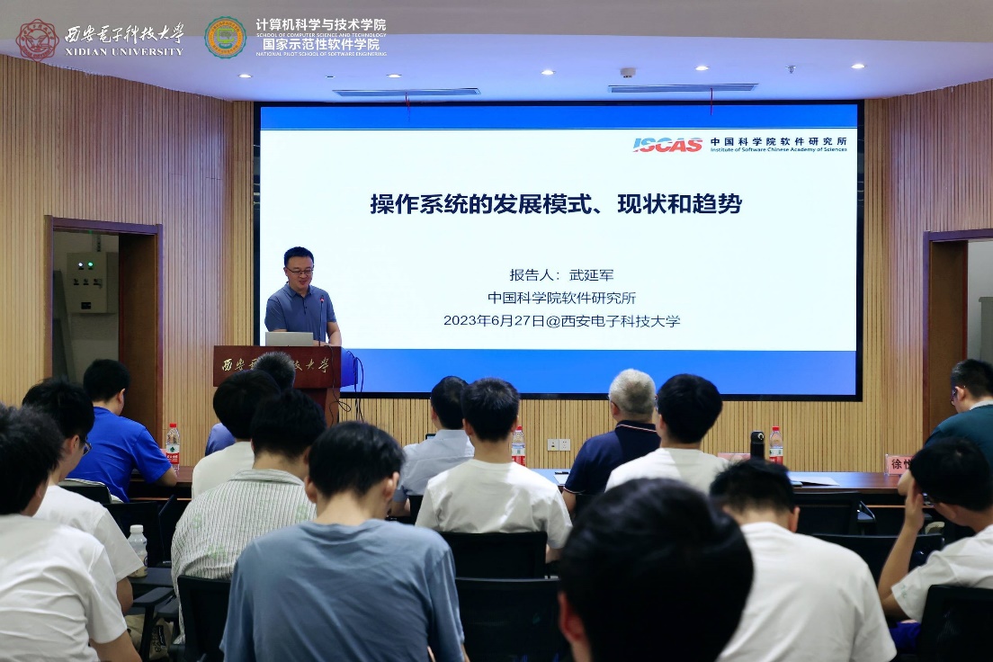 随后,在best365手机版官方网站南校区会议中心101会议室成功举行了“聚焦基础软件 拥抱开源生态”的学术报告,李青山教授主持学术报告会并致欢迎词,热烈欢迎陈海波教授、武延军研究员的到访,并表示陈海波教授、武延军研究员是国产开源基础软件领域的知名学者,做出了一系列创新的学术成果,也领导着有影响力的科研团队,学院的各位青年教师和同学要珍惜这次交流的机会,虚心向陈海波教授、武延军研究员学习。