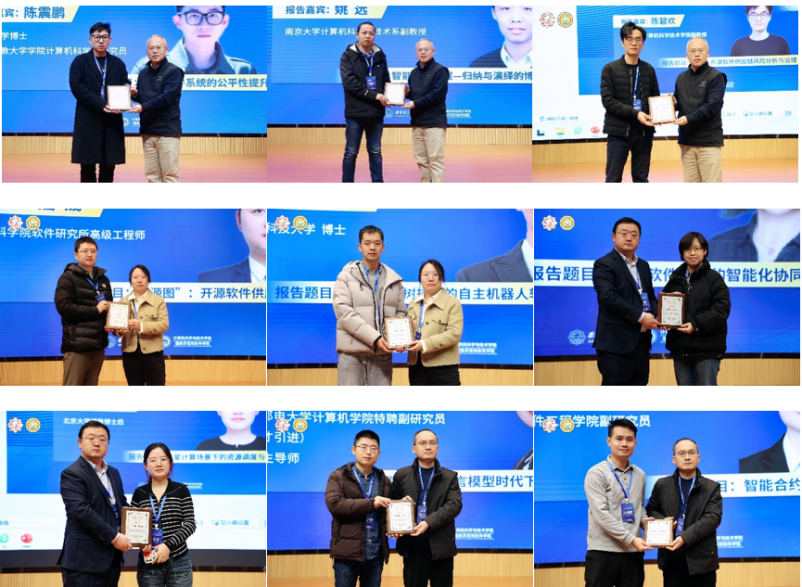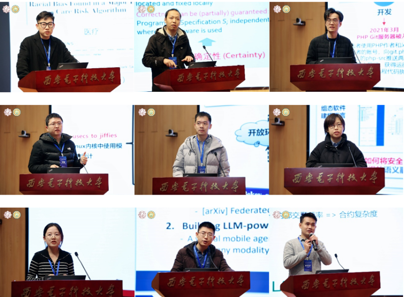 青年学者研讨会由李青山教授、李瑞教授,西安市智能软件工程重点实验室副主任王璐副教授以及计算理论与技术研究所副所长王小兵副教授主持。来自北京大学与英国伦敦大学学院的陈震鹏博士,南京大学姚远副教授,复旦大学陈碧欢副教授,中科院软件所屈晟高级工程师,国防科技大学杨硕博士,北京航空航天大学葛宁副教授,北京大学李晴博士,北京邮电大学徐梦炜博士,中山大学郑沛霖博士分别围绕智能软件系统的公平性提升、智能软件工程中的归纳与演绎的博弈与协同、开源软件供应链风险分析与治理、开源软件供应链安全实践、自主机器人软件开发方法、领域软件系统的智能化协同建模、卫星计算场景下的资源调度与优化、大语言模型时代下的边缘智能系统以及智能合约缺陷检测等主题带来了精彩的报告。
