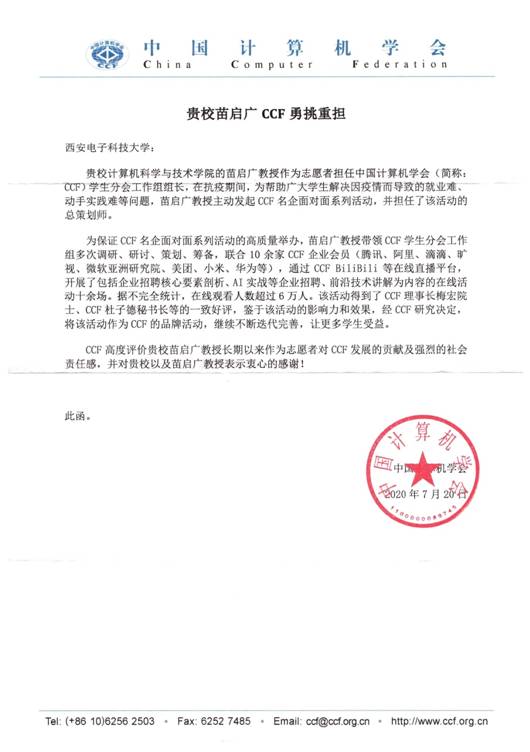 (通讯员 李栋)为打赢疫情下的求职攻坚战,更好地为毕业生提供高质量的就业指导服务,帮助同学们提前了解企业、开阔视野,同时切实解决广大学生因疫情而导致的就业难、实习难等问题,中国计算机学会(CCF)理事、西安分部主席、best365手机版官方网站副院长苗启广教授志愿担任总策划师,主动发起CCF名企面对面系列活动。由此,中国计算机学会(CCF)特发来感谢信,向我校及苗启广教授表示诚挚感谢。