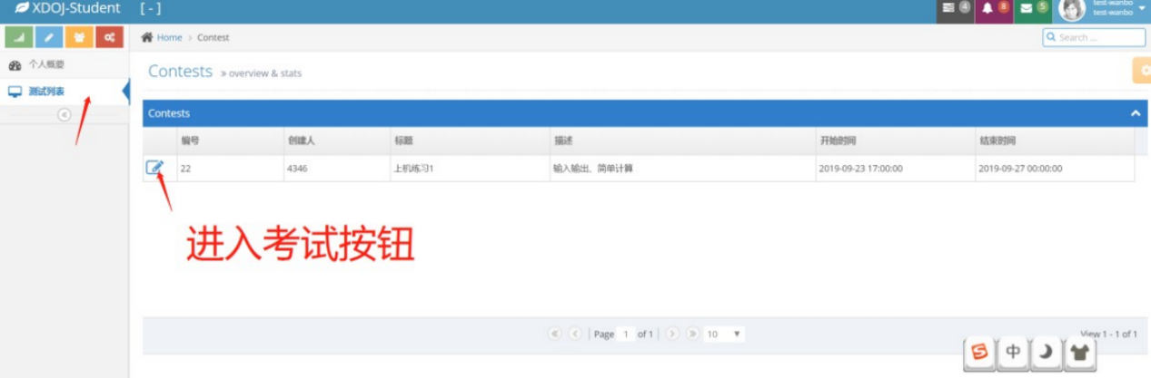 3.登录后点击左侧导航栏的“测试列表”菜单,即可查看考试信息,如下图所示。